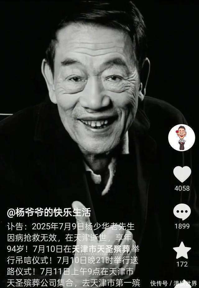 7月10号,杨议和杨伦哥俩发了讣告,文牍老爷子杨少华走了。这音信一出,网上立马炸开了锅,毕竟老爷子在相声界那然而巨擘级的东说念主物,说句不美妙的,那也算是喜丧了。可接下来爆出的灵堂相片,却让东说念主大跌眼镜。